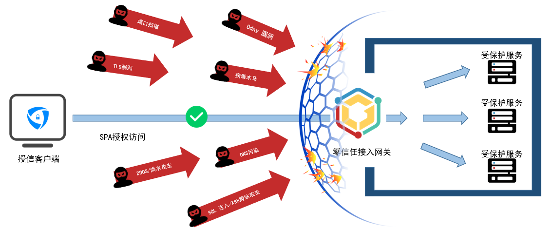 受保護(hù)的服務(wù)對(duì)未授權(quán)用戶及設(shè)備完全不可見,無法通過端口掃描發(fā)現(xiàn)服務(wù)。 這些服務(wù)默認(rèn)在互聯(lián)網(wǎng)實(shí)現(xiàn)“隱藏“。嚴(yán)格的終端單包敲門機(jī)制, 確保只有認(rèn)證過的用戶及設(shè)備才能訪問受保護(hù)服務(wù)。