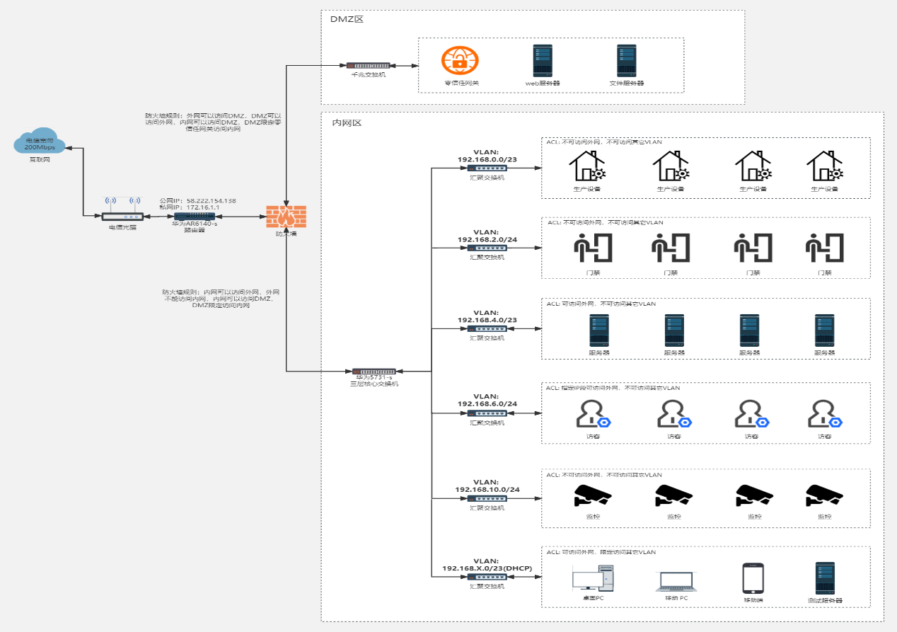 ? ? ? 其次,為了解決內(nèi)網(wǎng)安全隱患,根據(jù)業(yè)務(wù)類型和部門劃分不同的VLAN,各VLAN之間的通過ACL策略進(jìn)行合理的訪問控制。同時建立DMZ區(qū),DMZ區(qū)用來放置必須公開的服務(wù)器資源(如企業(yè)Web服務(wù)器、文件服務(wù)器、論壇等)和零信任網(wǎng)關(guān),外網(wǎng)、DMZ和內(nèi)網(wǎng)之間通過防火墻進(jìn)行隔離。