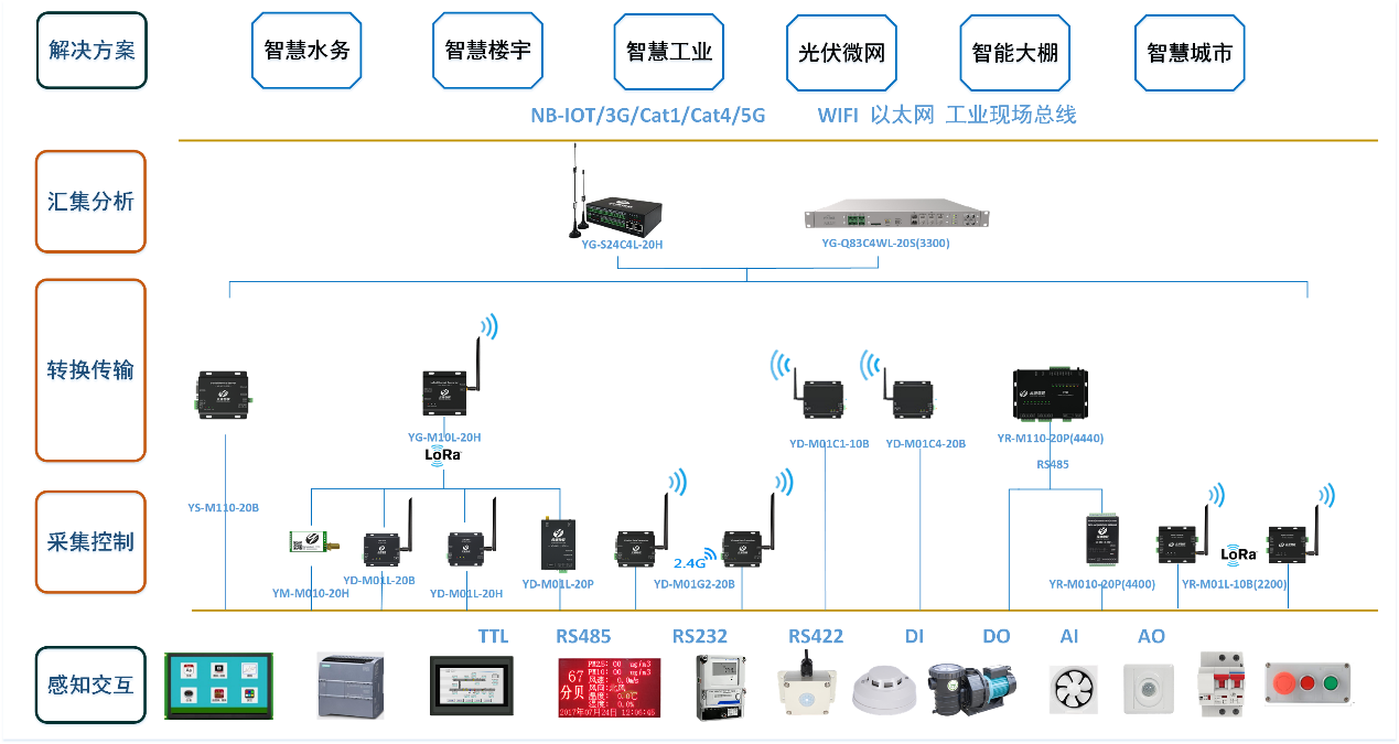 云涌科技智慧物聯(lián)網(wǎng)產(chǎn)品系列覆蓋采集控制、數(shù)據(jù)傳輸、數(shù)據(jù)分析等應(yīng)用場(chǎng)景,同時(shí)支持以太網(wǎng)、RS485、RS232、RS422等現(xiàn)場(chǎng)總線,支持模擬量和數(shù)字量的輸入和輸出,也支持4G CAT1、4G CAT4、LoRa、WIFI等無(wú)線傳輸方式,能滿足現(xiàn)場(chǎng)復(fù)雜的通訊需求。