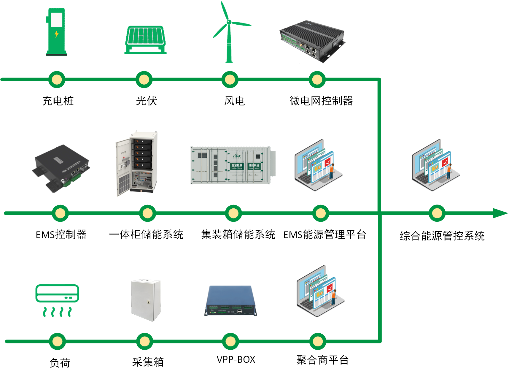 底層硬件——一體柜EMS控制器、微電網控制器、VPPBOX、規約轉換器、采集器、負荷控制器等。